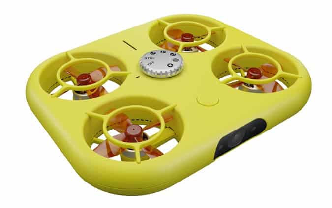 Talvez a melhor parte do Pixy seja que ele não precisa de um controlador ou um processo de configuração elaborado. O botão/seletor integrado permite que você escolha uma das quatro trajetórias de voo predefinidas. Há um dial de configurações dedicado localizado no centro. O drone funciona com quatro rotores, cobertos com uma capa protetora.