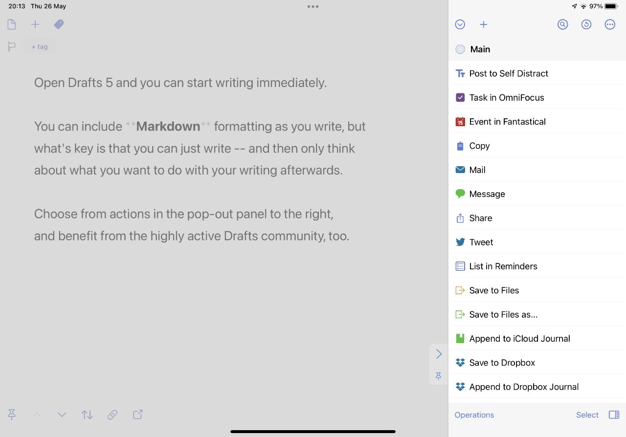 O Drafts 5, que também está disponível para Mac e iPhone, possui uma biblioteca de ações que permite criar fluxos de trabalho completos para o seu trabalho.