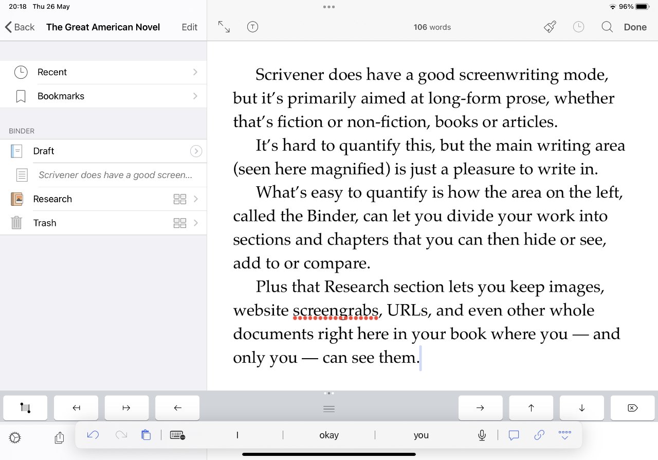Enquanto o aplicativo para iPad é apenas bom, aproximando-se muito bem. Ele teve alguns bugs ao longo dos anos e o suporte da empresa nem sempre foi maravilhoso, mas há escritores que usam apenas a versão para iPad e nem têm um Mac.