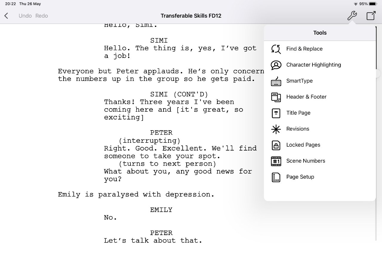 E eles são complicados o suficiente para que um iPad faça o máximo possível desse trabalho para você. Permite que você se concentre no que está acontecendo no script, enquanto seu aplicativo de escrita cuida de torná-lo legível na tela.