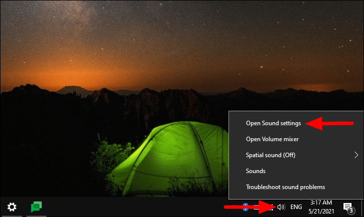 Para ajustar a reprodução de áudio, clique com o botão direito no ícone ‘Alto-falante’ à direita da barra de tarefas e selecione ‘Abrir configurações de som’ no menu.
