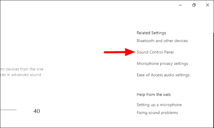 Na janela ‘Configurações’, clique em ‘Painel de controle de som’ em ‘Configurações relacionadas’ próximo ao canto superior direito.