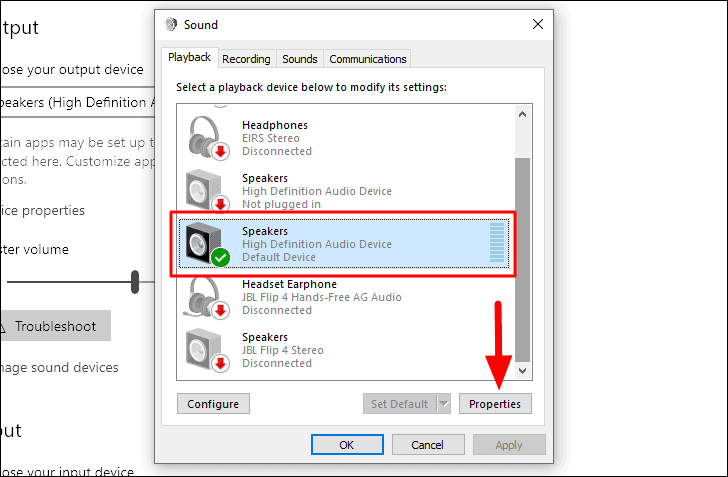 Na caixa ‘Som’, selecione o dispositivo de reprodução atual e clique em ‘Propriedades’ na parte inferior.