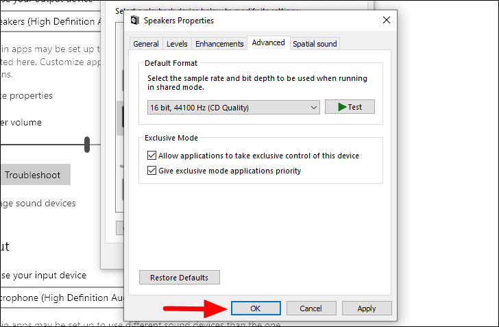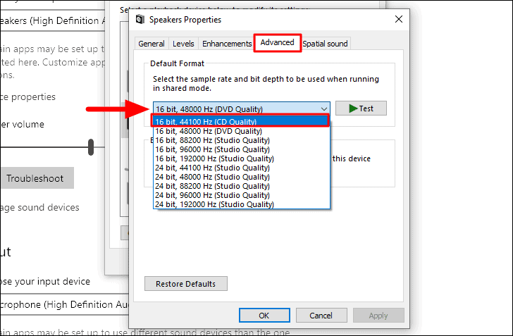 A caixa ‘Propriedades dos alto-falantes’ será aberta. Navegue até a guia ‘Avançado’, clique na caixa e selecione a primeira opção no menu suspenso.