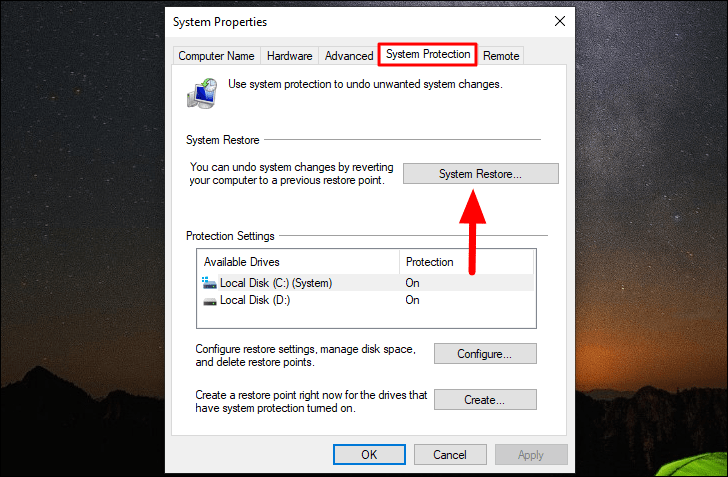 Em seguida, clique em ‘Restauração do sistema’ na guia ‘Proteção do sistema’.