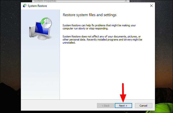A janela ‘Restauração do sistema’ será aberta. Clique em ‘Avançar’ na parte inferior para prosseguir.