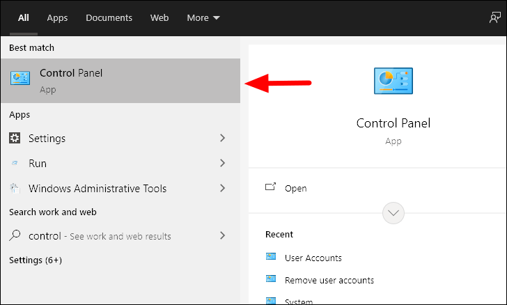 Para aumentar a taxa do processador, pesquise por ‘Painel de controle’ no ‘Menu Iniciar’ e, em seguida, inicie o aplicativo a partir dos resultados da pesquisa.