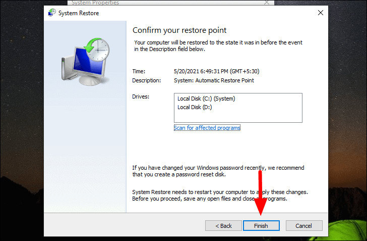 O sistema será reiniciado para que o processo seja concluído, portanto, salve todos os arquivos abertos para evitar perda de dados. Além disso, a restauração do sistema não afeta nenhum arquivo do sistema, mas restaura as configurações e remove programas que foram instalados recentemente.