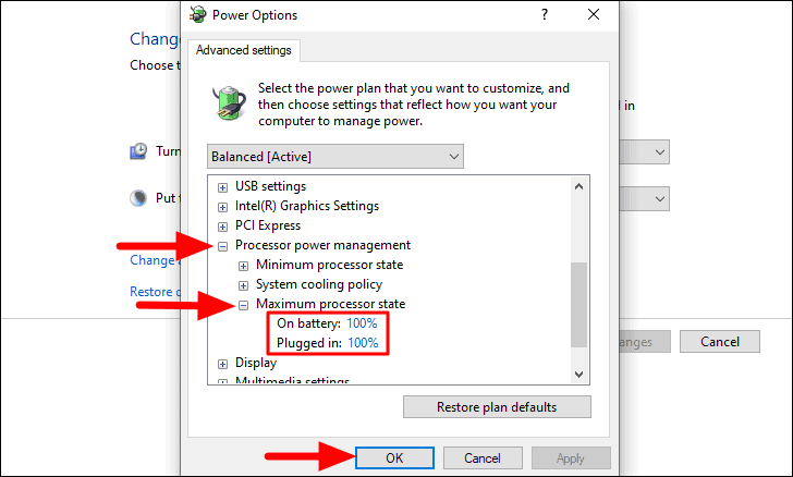 Em seguida, clique duas vezes em ‘Gerenciamento de energia do processador’ e, em seguida, em ‘Estado máximo do processador’ abaixo dele. Agora você encontrará duas opções, ‘Na bateria’ e ‘Conectado’ com a taxa do processador mencionada no caso de cada uma. Agora, clique na porcentagem e aumente para’100%’em ambos os casos e clique em’OK’na parte inferior para aplicar as alterações e fechar a janela.