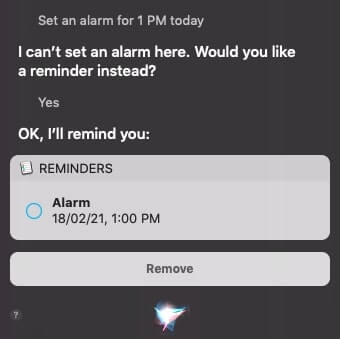 Mencionei a ausência da funcionalidade de alarme embutido no primeiro parágrafo deste post. Isso é refletido quando você inicia a Siri no seu Mac e pede para definir um alarme. Em vez disso, ele oferecerá que você defina um lembrete. Se você quiser, você pode ir em frente com isso. Veja a captura de tela abaixo.