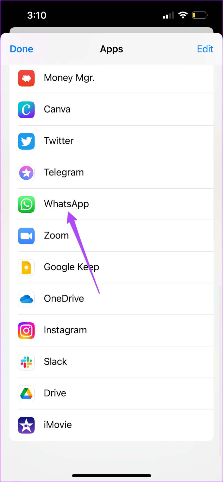 Etapa 4: Na lista de aplicativos, role para baixo e selecione WhatsApp. p>