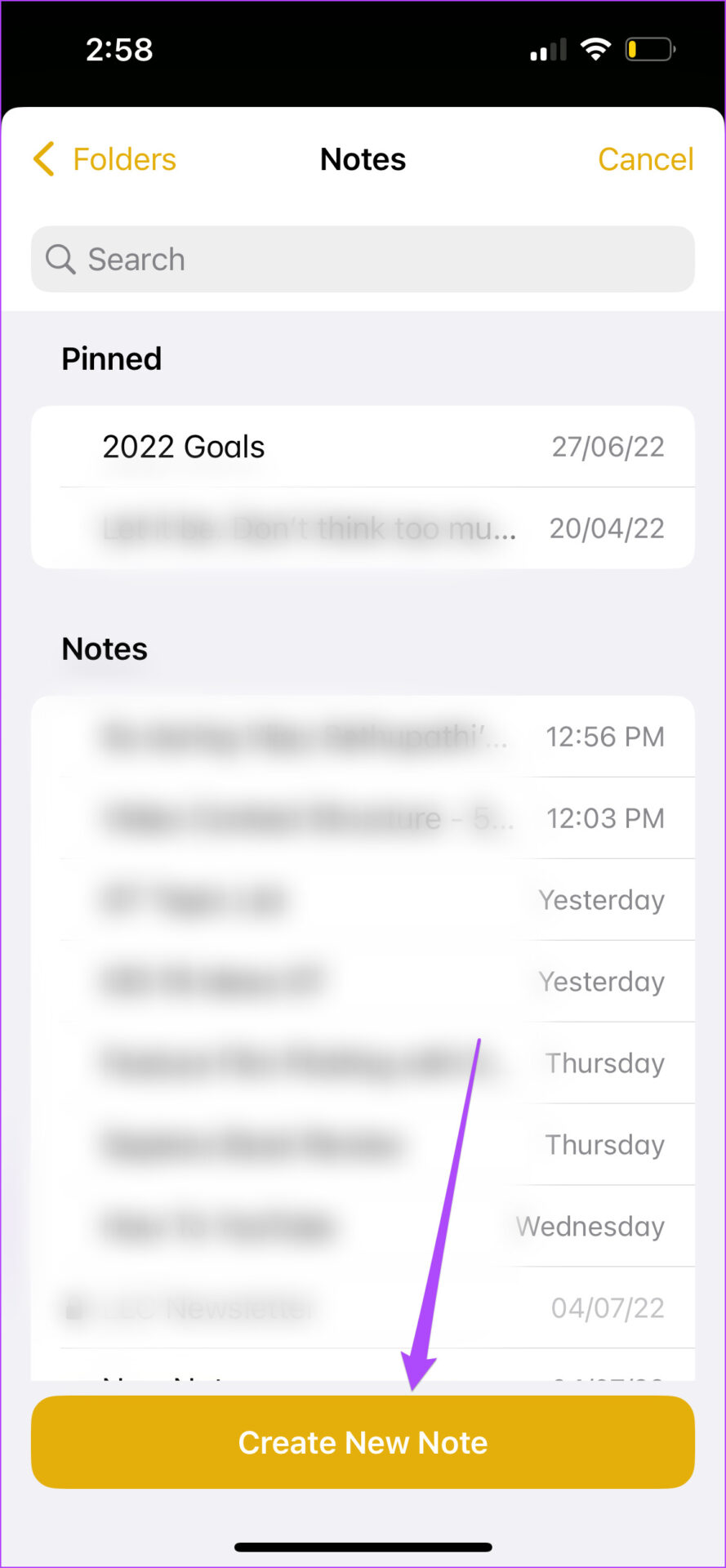 Depois de selecionar o nome da pasta, toque em Criar nova nota.