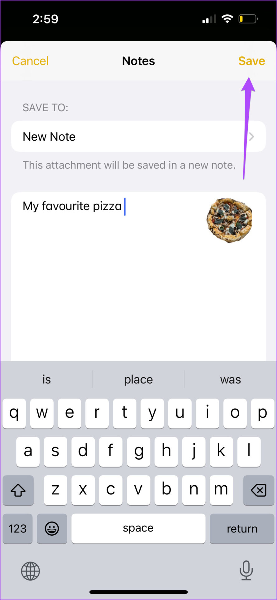 Etapa 4: Digite seu texto para a nota e toque em Salvar.