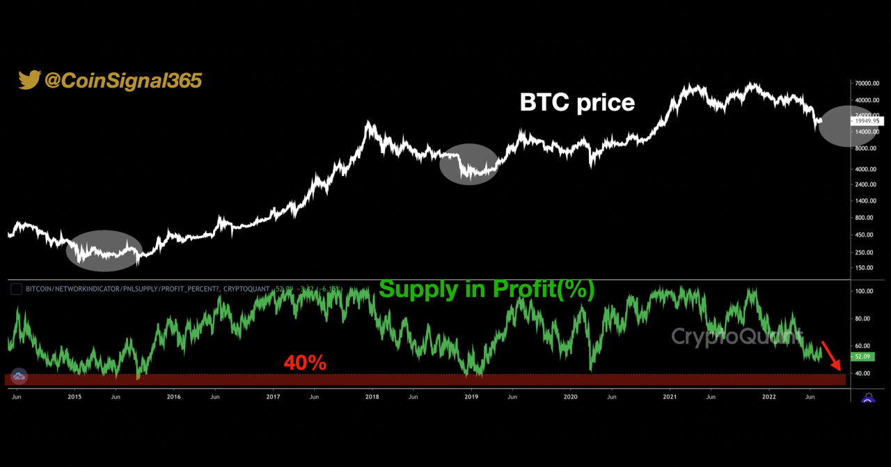 No mês passado, quando o Bitcoin caiu para um mínimo de US$ 17,6 mil, a oferta em perda atingiu mais de 50%, mas ainda era menor que o limite exigido de 60%.
