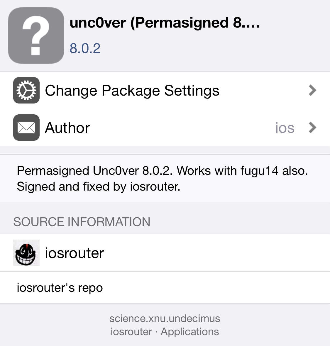 O aplicativo unc0ver v8.0.2 modificado pelo iosrouter com capacidade de assinatura permanente ilities está disponível no repositório pessoal do iosrouter por meio de qualquer aplicativo gerenciador de pacotes que você preferir. A URL para esse repositório é a seguinte: