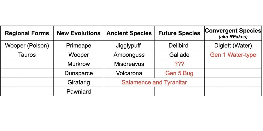 Além disso, alegadamente ainda existem formas regionais, o que significa que o estilo que conhecemos funcionará como vimos; estes terão o mesmo nome e número que o Pokémon original, mas uma variante de tipo diferente. Há também algumas novas linhas de evolução para Pokémon. Não se trata de nenhum tipo de variante, apenas evoluções para Pokémon que anteriormente não possuíam uma, ou novas linhas evolutivas. O CentroLeaks publicou um gráfico dos Pokémon que eles disseram que receberiam essas várias formas. Estes não são todos; se os vazamentos forem verdadeiros, pode haver mais.
