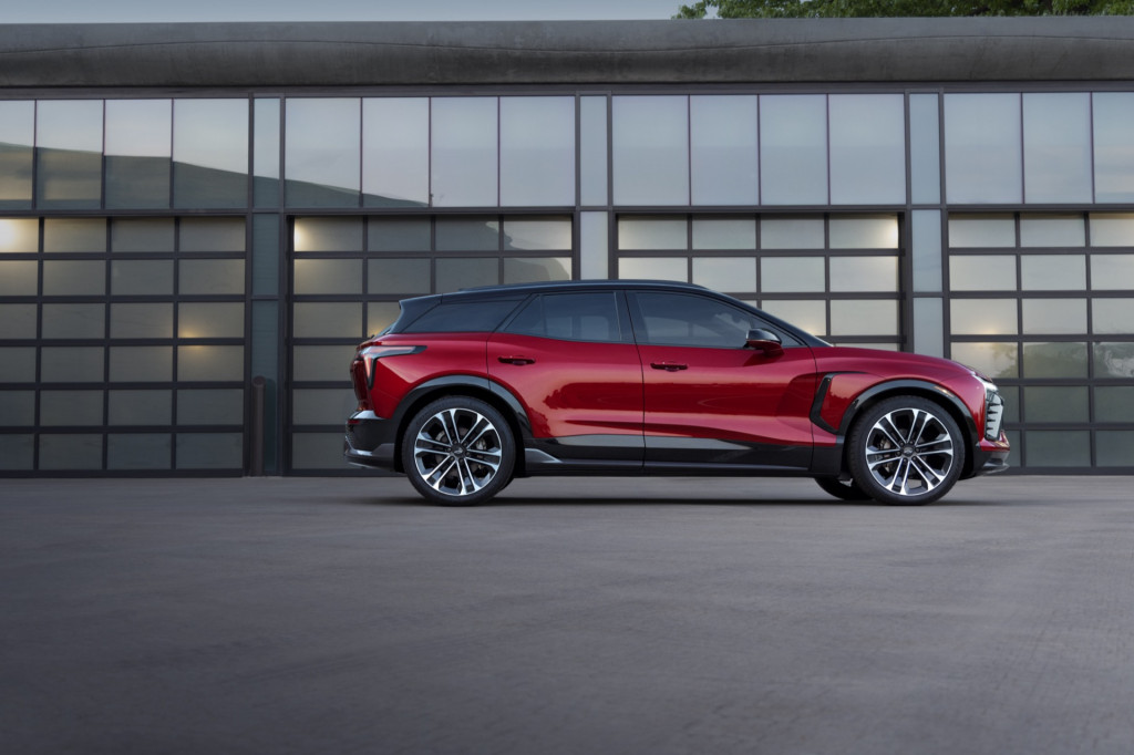 O exterior apresenta uma linha de teto veloz rebaixada, proporções atléticas e um layout de garrafa de Coca-Cola semelhante ao Camaro com uma linha de cintura arrebatadora. Os arcos das rodas traseiras se alargam acima das rodas de 19 polegadas nos modelos básicos, embora os designs SS de melhor especificação rolem em rodas de 22 polegadas calçadas com pneus de todos os períodos (borracha de verão será uma seleção). Chevy mencionou que a ventilação do pára-choque dianteiro é uma homenagem ao seu recorde de automobilismo. A barra de luz frontal iluminada nos modelos RS e SS comunica o status de carregamento com uma animação. Os designs LT serão consideravelmente menos chamativos com um visual monocromático, embora os designs RS funcionem com uma grade preta, detalhes externos pretos e rodas de 21 polegadas. O produto SS adquirirá um painel frontal exclusivo do produto com guarnições menos do que os faróis que se parecem com as entradas de ar do Camaro.