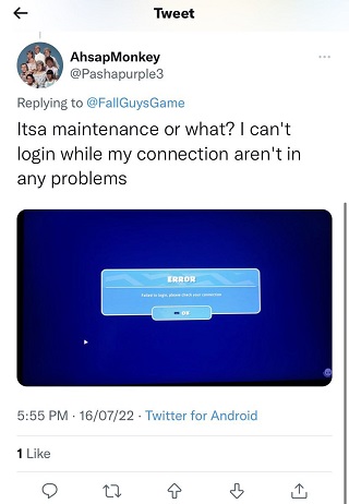 @FallGuysGame o que está acontecendo com a tela inicial dos caras do outono. Eu continuo recebendo um erro pop-up que diz que falhou ao fazer login, tente novamente. Já reiniciei o jogo mais de 5 vezes e nada. Não há nada de errado com outros jogos online. (Fonte)