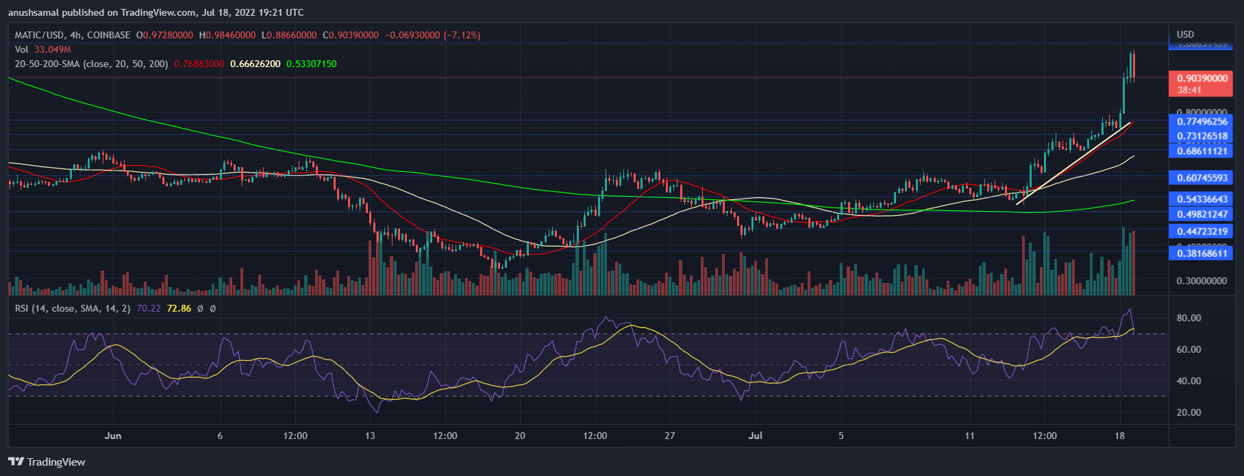 Os touros da altcoin estão agora no controle, pois os compradores recuperaram a confiança na moeda. MATIC foi supervalorizado no momento da escrita. As perspectivas técnicas para a moeda permaneceram otimistas no gráfico de quatro horas. A altcoin continuou a formar altas mais altas, que são uma indicação de força de alta no gráfico. Se os touros mantiverem o atual momento de preço, a MATIC em breve revisitará a marca do dólar.