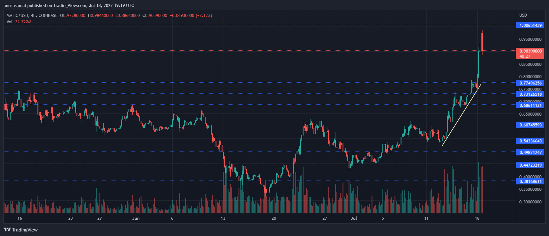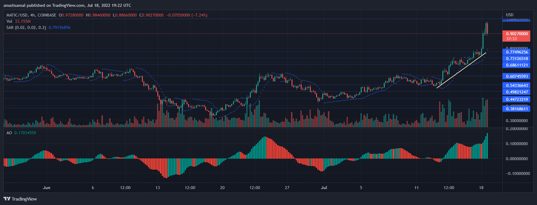 A altcoin estava sendo negociada a US$ 0,903 no gráfico de quatro horas. MATIC estava muito perto de revisitar $ 1,00. Se os compradores mantiverem o impulso, o MATIC continuará subindo. A resistência de sobrecarga da moeda ficou em US$ 1,00.