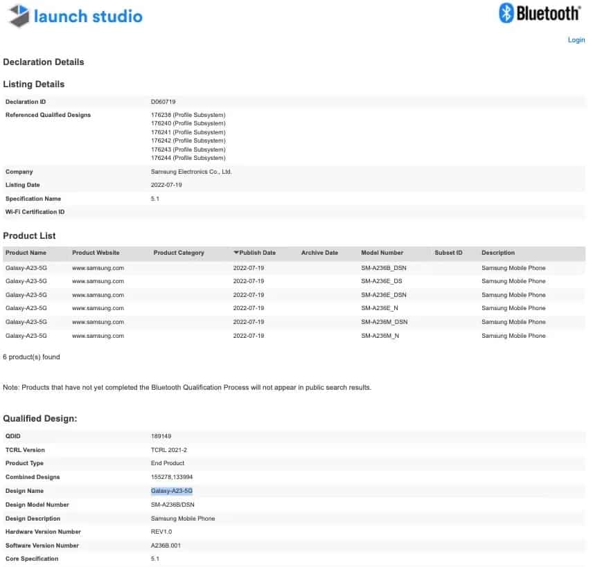 O site Bluetooth SIG lista o próximo telefone Samsung, que carrega o número do modelo SM-236B, completo com seu apelido-Galaxy A23 5G. A maioria dos avistamentos anteriores continha apenas o número do modelo. Junto com o SM-236B, o telefone também é identificado pelos números de modelo SM-A236E, SM-A236M e SM-A236U. Este último deve ser a variante americana do aparelho.