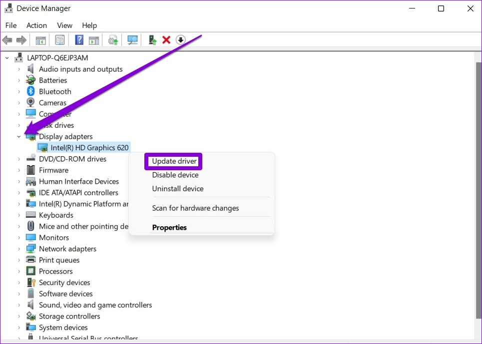 Etapa 2: Clique duas vezes em Adaptadores de vídeo para expandi-lo. Clique com o botão direito do mouse no driver de vídeo e selecione a opção Atualizar driver.