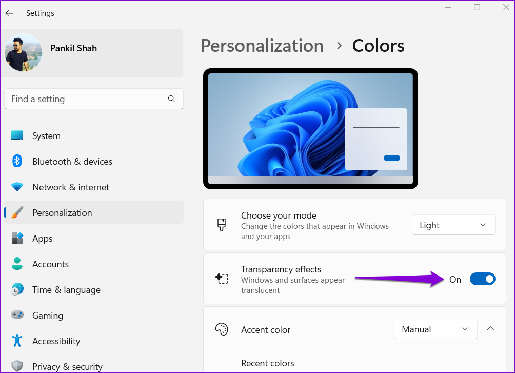 Você precisa verificar se habilitou os efeitos de transparência em seu PC. Se não tiver certeza, siga as etapas abaixo para ativar os efeitos de transparência no Windows 11.