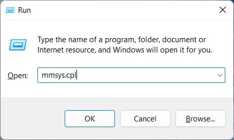 1. Use o atalho “Windows + R” para abrir o prompt Executar. Aqui, digite mmsys.cpl e pressione Enter.