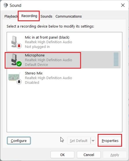 2. Em seguida, vá para a guia”Gravação“e escolha seu microfone. Depois disso, clique em “Configurar” no canto inferior esquerdo.