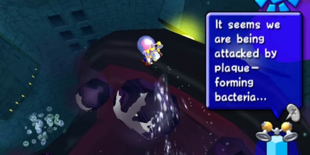 É um conceito encantador. Quando a luta começa, Mario encontra pedaços de bactérias provenientes dos dentes da enguia. Para ganhar o brilho, Mario tem que limpar a boca da enguia. Uma vez que a enguia é derrotada, o companheiro de Mario, FLUDD, compartilha uma mensagem importante: “Lembre-se de cuidar bem dos seus dentes!” Obrigado, FLUDD!