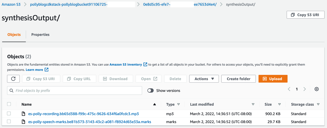Para revisar a saída, abra o console do Amazon S3 e verifique se o arquivo de áudio (.mp3) e o arquivo de marca de fala (.marks) são armazenados no bucket do S3 em