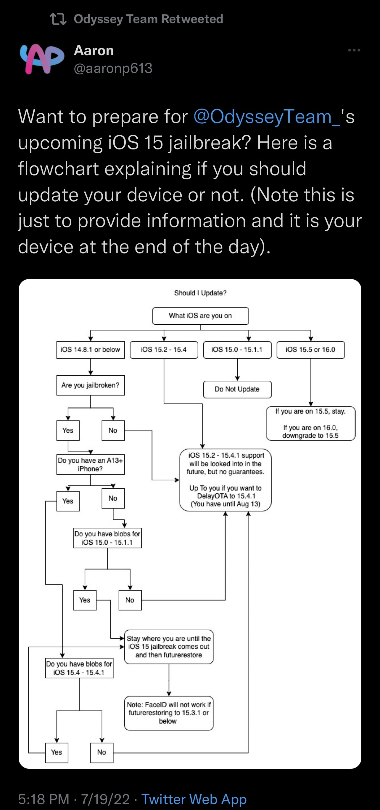 O fluxograma geralmente está correto na maioria dos casos; no entanto, aconselhamos nossos leitores a decidir por si mesmos se vale a pena perder seu jailbreak atual ou jogar com elegibilidade para jailbreak no futuro. Atualmente, o único lançamento de jailbreak certo será para iOS e iPadOS 15.0-15.1.1, mas vale a pena notar que o pesquisador de segurança Linus Henze planeja fazer uma demonstração do Fugu15 com suporte para iOS e iPadOS 15.4.1 em outubro. Ninguém sabe ainda se Henze planeja lançar isso publicamente.