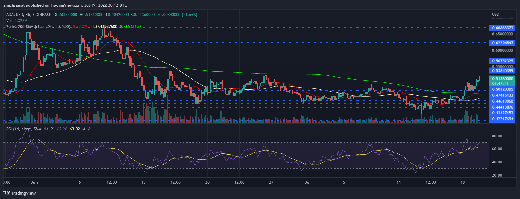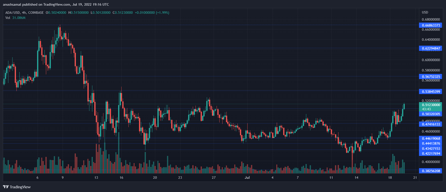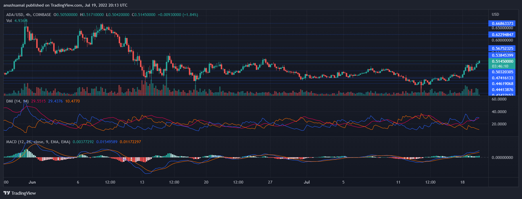 Cardano custava US$ 0,506 no gráfico de quatro horas | Fonte: ADAUSD no TradingView