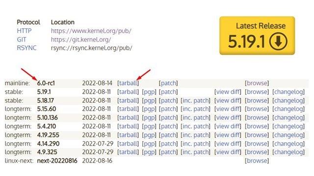 Como alternativa, você pode baixar diretamente o arquivo Linux 6.0 Tarball (.tar) mais recente em seu computador e usá-lo. Aqui está o link de download direto para Linux 6.0-rc1.