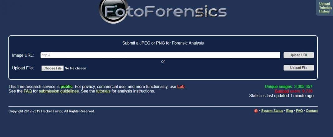 FotoForensics é uma das melhores ferramentas online que executa alguns testes em uma imagem enviada. O melhor do FotoForensics é que ele exibe o mapa de calor de compressão como saída.