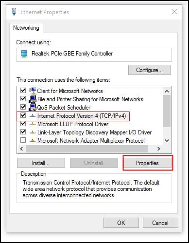 4. Navegue até a guia Rede e, em”Esta conexão usa os seguintes itens”, selecione Protocolo de Internet versão 4 (TCP/IPv4) e clique em propriedades.