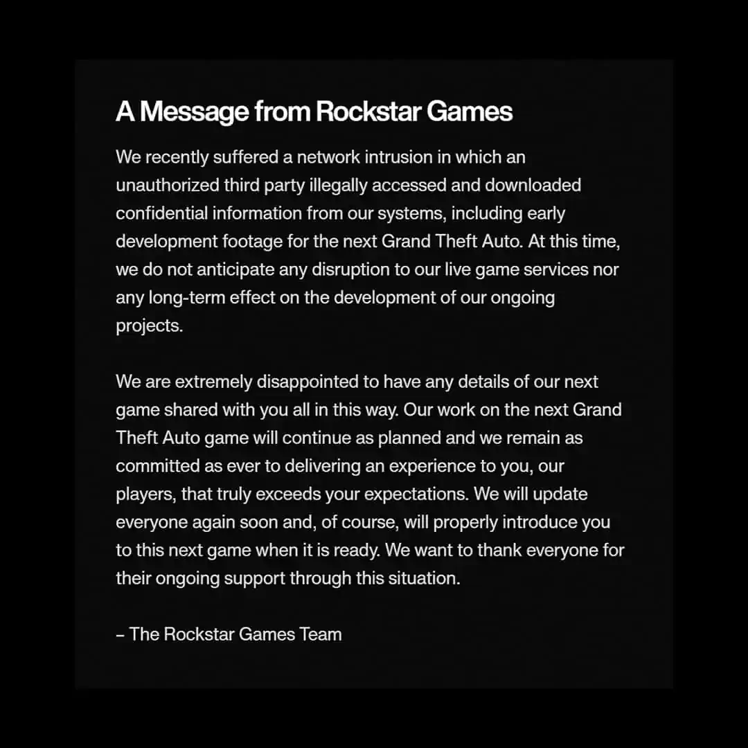 A Rockstar divulgou um comunicado oficial confirmando o vazamento e informando que está investigando o vazamento. “Recentemente, sofremos uma invasão de rede na qual um terceiro não autorizado acessou e baixou ilegalmente informações confidenciais de nossos sistemas”.
