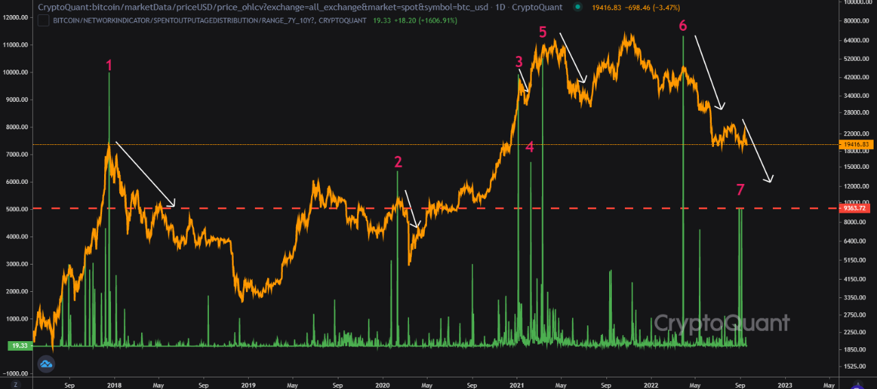 O analista explica que sempre que o gasto do 7 anos a 10 anos ultrapassa 5000, o BTC geralmente observa uma tendência de baixa em seu valor.