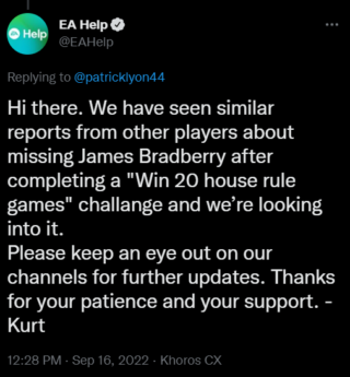 Felizmente, o suporte da EA não demorou muito para reconhecer esse problema e disse que está investigando isso. No entanto, eles não forneceram nenhum ETA para a correção.
