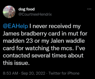 @EAHelp @MaddenNFLDirect @EASPORTS_MUT ainda esperando no BND James Bradberry das regras da casa. Isto é ridículo. Se os pontos não pudessem ser comprados por algum motivo, vocês consertariam em 5 minutos. Eu sei porque já vi.