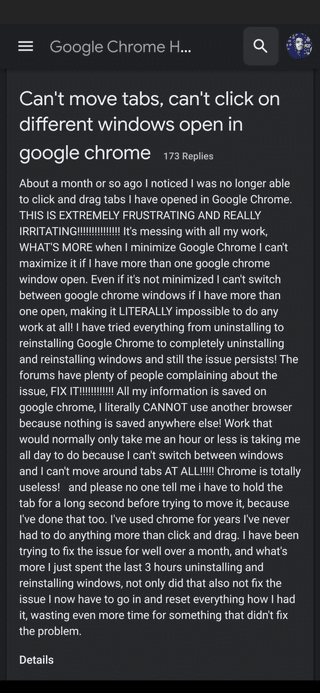 Sou tendo esse problema também. Como redator de conteúdo, geralmente organizo minhas guias para que seja mais fácil navegar em quais tópicos/recursos eu poderia usar em seguida. O recurso de clicar e arrastar era lindo e, quando tentei mover as guias pela primeira vez hoje, fiquei alarmado. Embora eu esteja feliz por não ser o único a ter um problema como esse, espero que todos tenham seus problemas do Chrome resolvidos também.