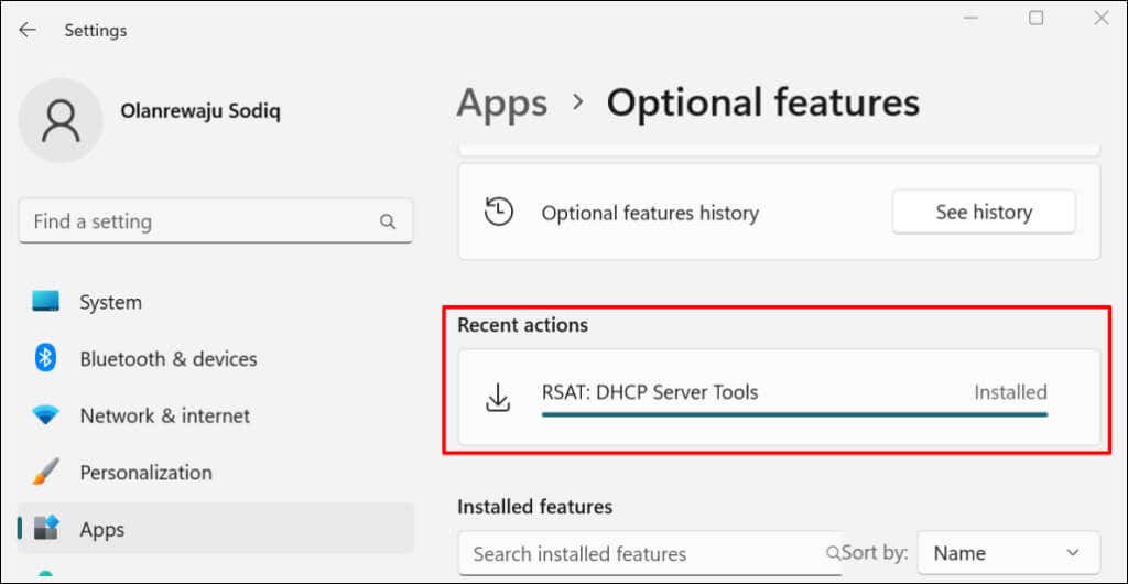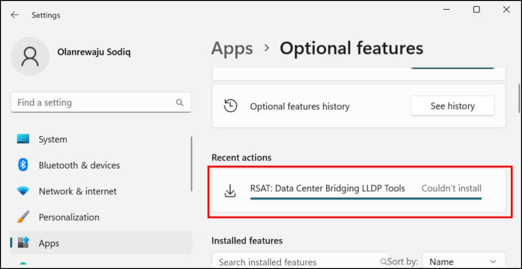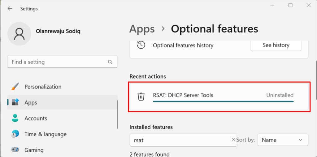 Vá para Configurações > Aplicativos > Recursos opcionais, digite rsat na caixa de pesquisa”Recursos instalados”e selecione o RSAT que deseja desinstalar. Aguarde alguns segundos e verifique a seção “Ações recentes” para verificar se o Windows desinstalou o RSAT.