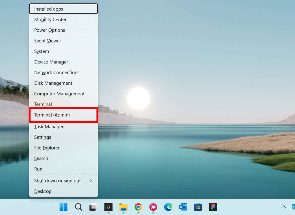 Clique com o botão direito do mouse no ícone do Windows na barra de tarefas ou pressione a tecla Windows + X e selecione Terminal (Admin). Cole o seguinte comando no console e pressione Enter.