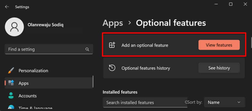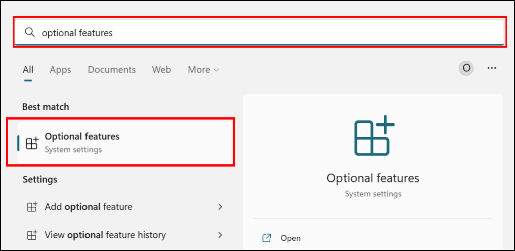 Como alternativa, pressione o botão Iniciar, digite recursos opcionais na barra de pesquisa e selecione a opção Configurações do sistema de recursos opcionais.