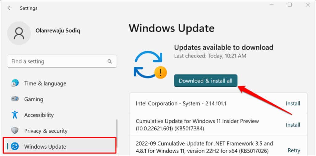 Reiniciar e atualizar seu computador para a versão mais recente do Windows 11 pode corrigir problemas de RSAT. Vá para Configurações > Windows Update e selecione Verificar atualizações ou Baixar e instalar tudo.