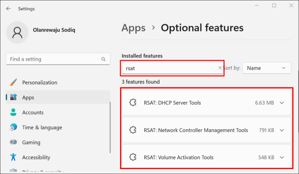 Vá para Configurações > Aplicativos > Recursos opcionais e digite rsat na caixa de pesquisa”recursos instalados”. Você verá os recursos RSAT instalados em seu computador nos resultados da pesquisa.