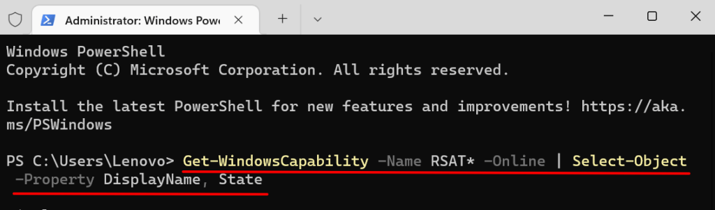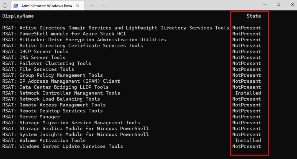 Get-WindowsCapability-Name RSAT*-Online | Select-Object-Property DisplayName, State