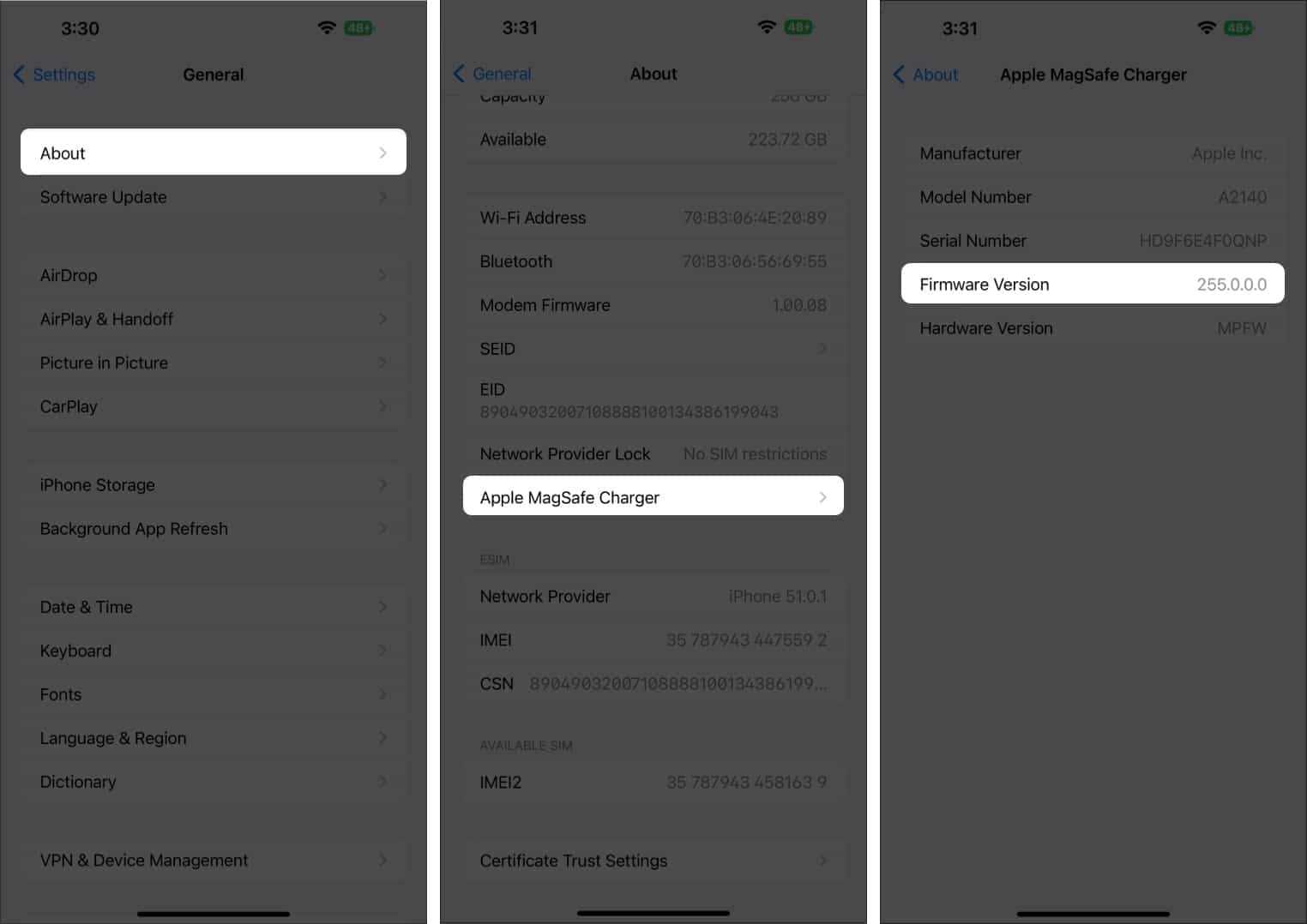 Basta ir para Configurações → Geral → Sobre → Apple MagSafe Charger. Aqui, você poderá ver o número do modelo e a versão do firmware do carregador MagSafe.