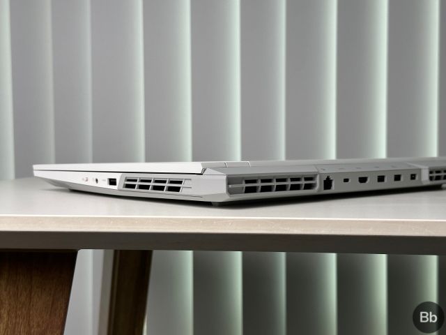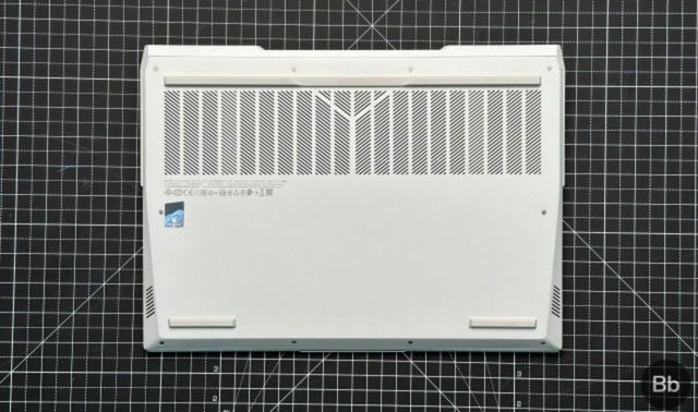 A parte inferior do laptop combina com a estética superior. Revestido em branco fosco, apresenta uma grande ventilação de malha de entrada de ar singular, juntamente com pés de borracha elevados e linhas inclinadas com curvas. Isso ajuda a máquina na ventilação quando colocada em várias superfícies. Os lados do laptop são naturalmente grossos, pois abrigam uma grande ventilação cada. Há também grandes aberturas duplas na parte traseira, flanqueando o painel de E/S. Portanto, embora você obtenha um excelente resfriamento (mais sobre isso abaixo), não espere um equipamento fino. Além disso, você também pode ver os alto-falantes em ambos os lados aqui.