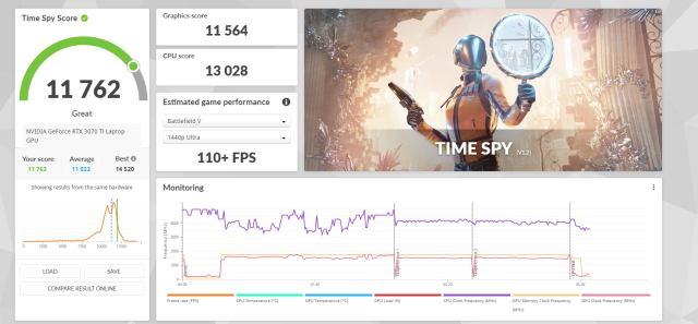3DMark é um teste intensivo de GPU que executa vários cenários semelhantes a jogos e distribui uma pontuação. Depois de passar por algumas animações do teste, o Legion 5i Pro deu uma pontuação total de 11.762. Como antes, esta é uma pontuação impressionante que simplesmente confirma o desempenho de alta potência da RTX 3070 Ti que observamos acima.